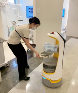 同院に導入された運搬ロボットは、診療スペースと滅菌室を自動で往復します。使用済み器具を滅菌室に運び、滅菌済み器具を診療スペースに返却する用途で活用されており、歯科施設の業務において、スタッフの負担を軽減し、作業の効率化を図ることが可能です。